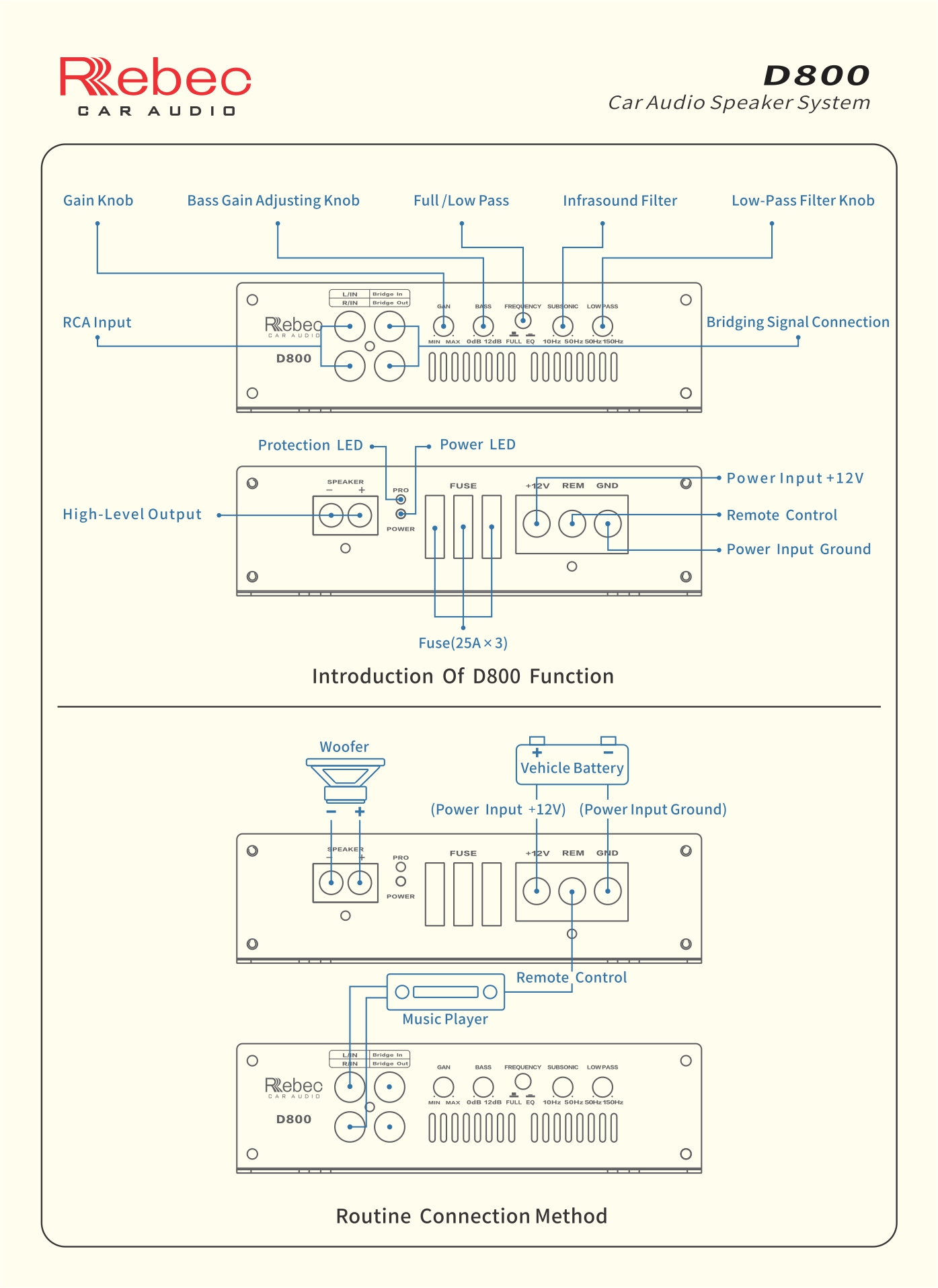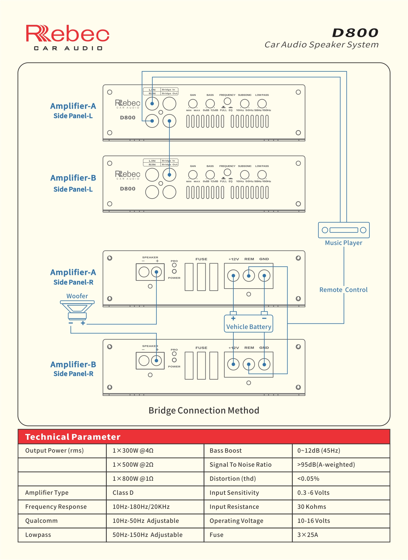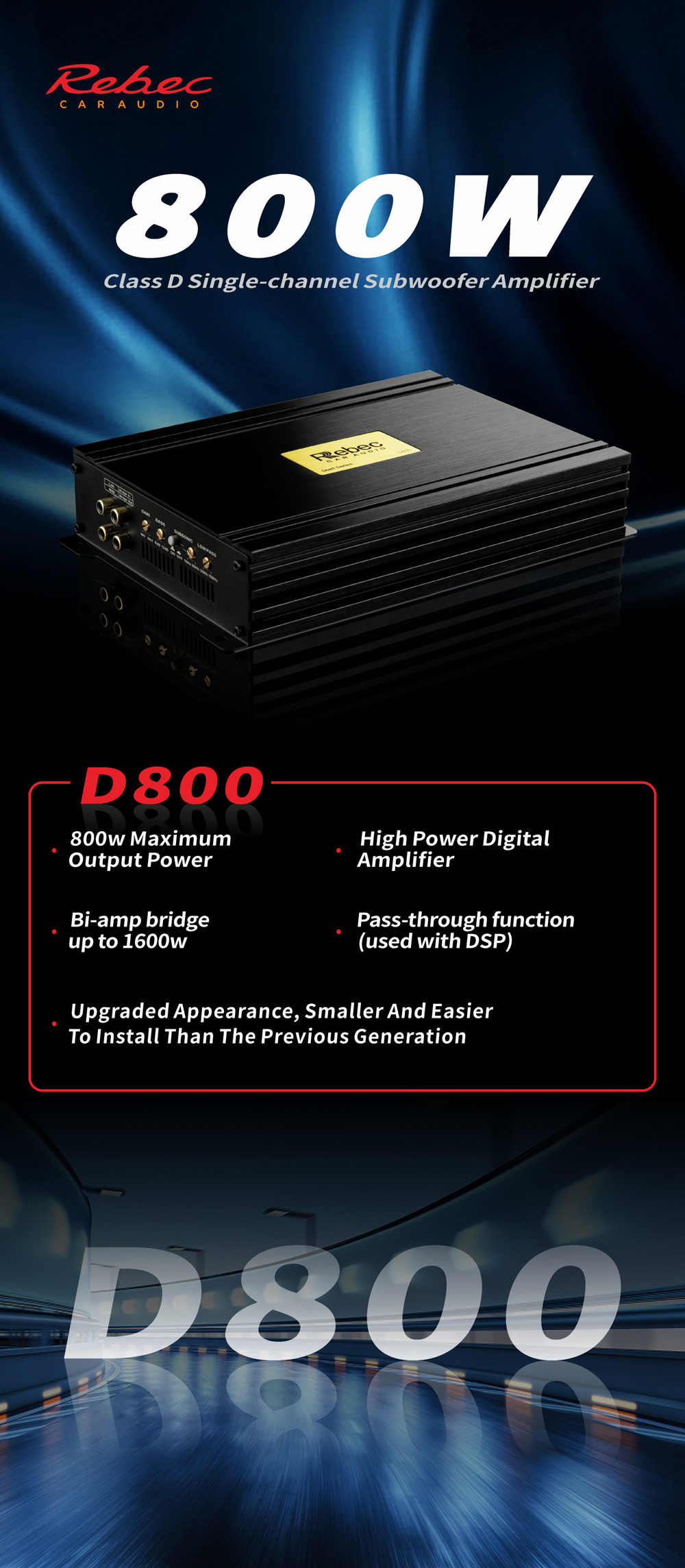 Amply oto Rebec D800 – Dòng amply mono công suất lớn – chuyên kéo SUBWOOFER – Chức năng Bi-amp Bridge mở rộng lên đến 1600Watts khi phối ghép 2 amply. Kích thước nhỏ gọn, dễ dàng lắp đặt cho các dòng xe diện tích nhỏ.