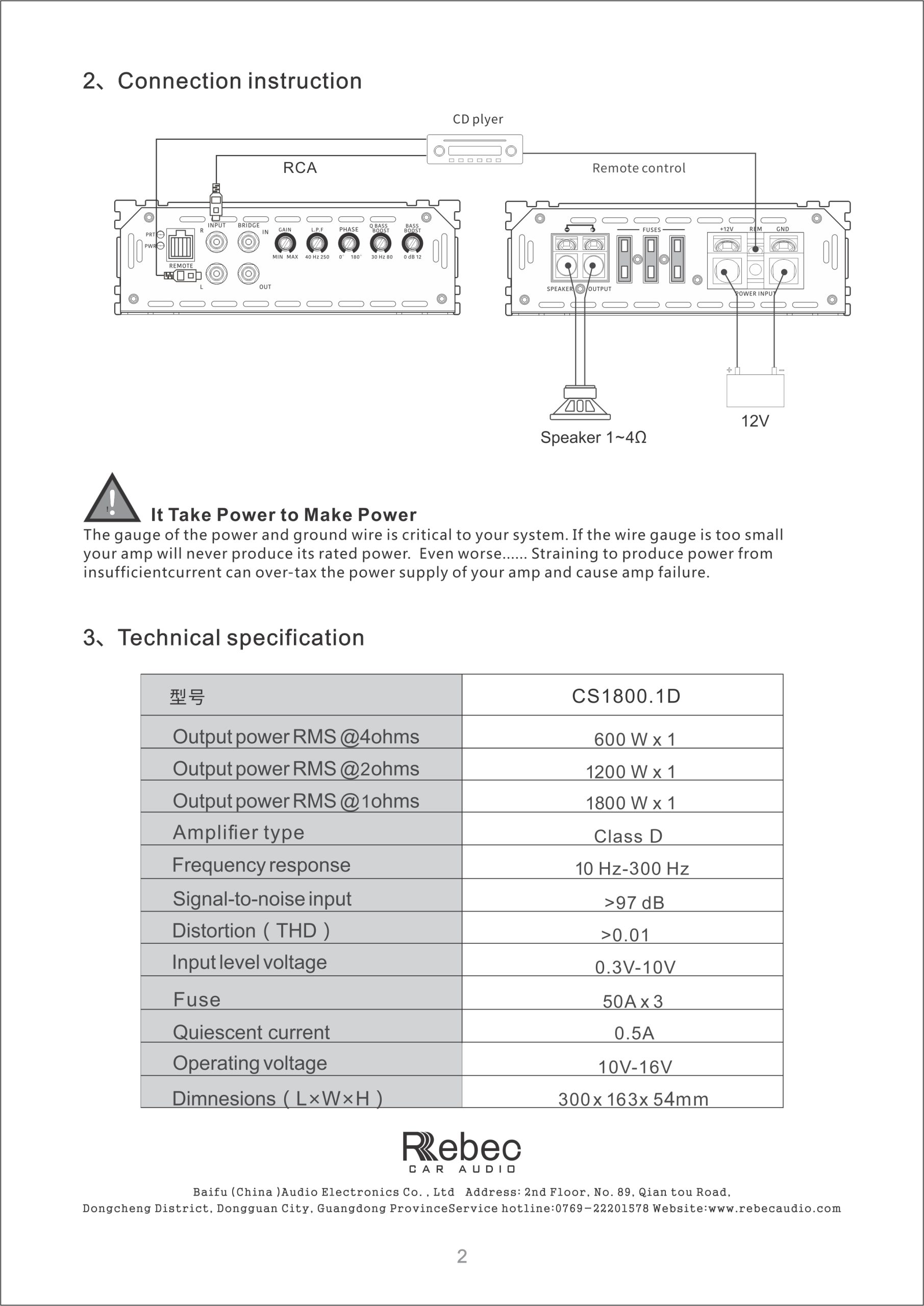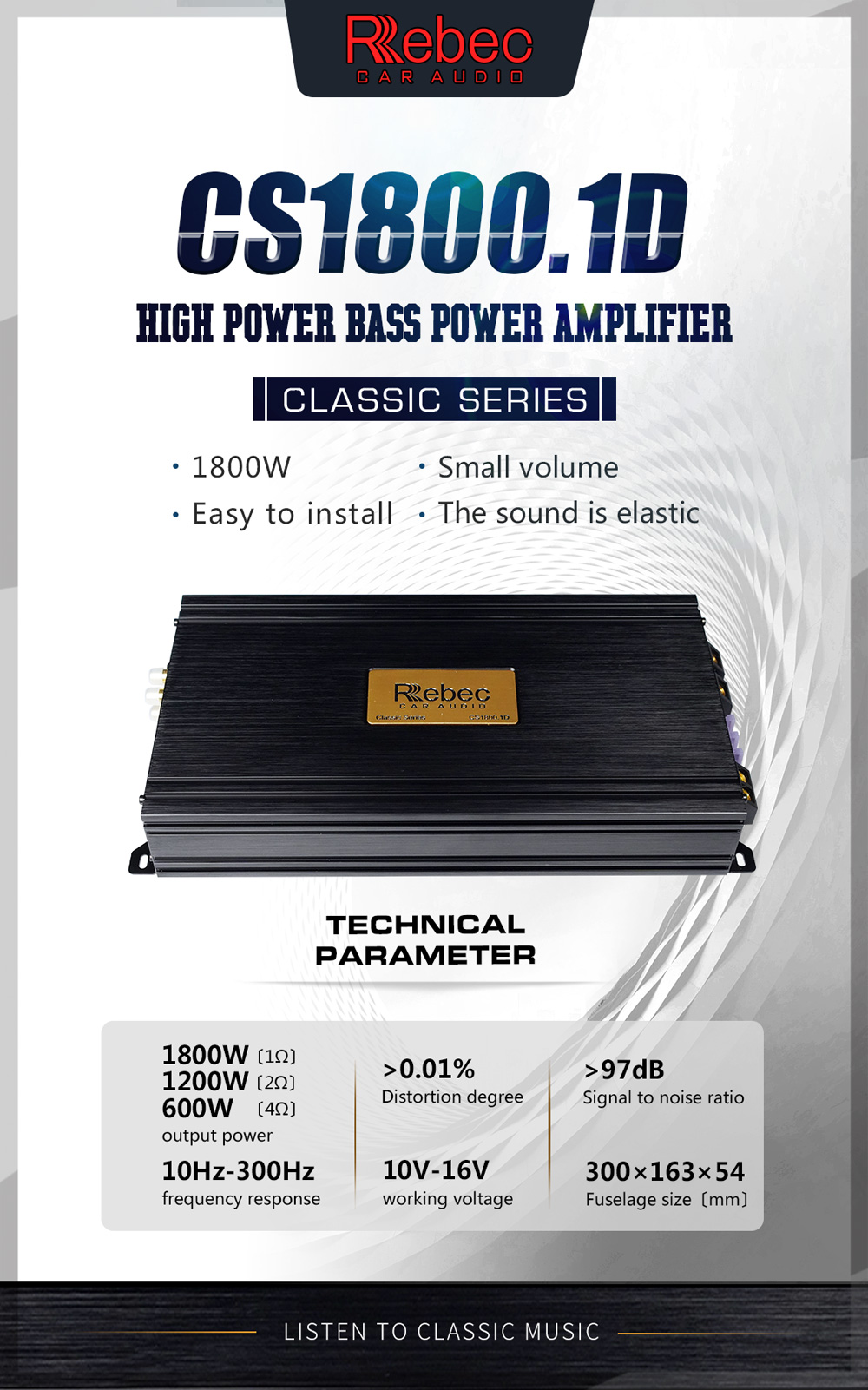 Amply oto Rebec CS1800.1D – Là mẫu Amply mono chuyên dụng kéo loa SUB thuộc phân khúc cao cấp “Classic Series” của Rebec. Công suất hỗ trợ linh hoạt, hiệu suất cao với 600W @4ohm / 1200W @2ohm / 1800W @1ohm.