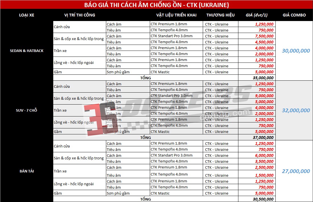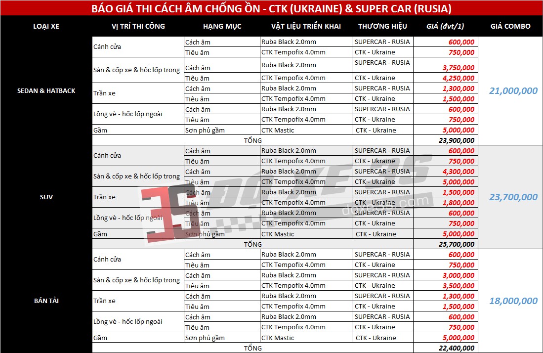 Chúng tôi tư vấn bạn cân nhắc kết hợp vật liệu chống ồn CTK của UKRAINE & SUPERCAR của NGA theo các hạng mục như sau.