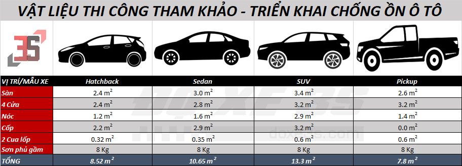 Dưới đây là bảng kích thước dán chống ồn theo các dòng xe