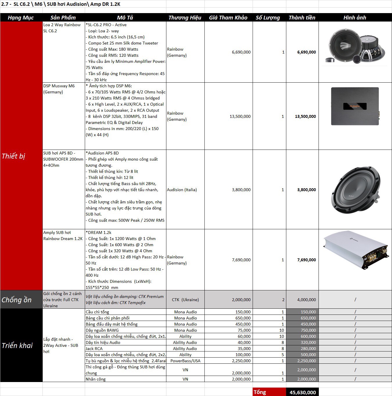 Cấu hình 2 way active lới sub hơi audison, dsp m6, amply kéo sub