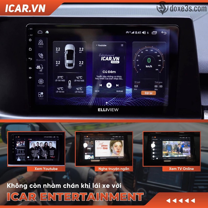 Phần mềm giải trí độc quyền ICAR Entertainment với tất cả youtube, radio, tin tức, tivi… tích hợp trong một, ứng dụng có thể chạy nền, tự phát tiếp khi khởi động xe.